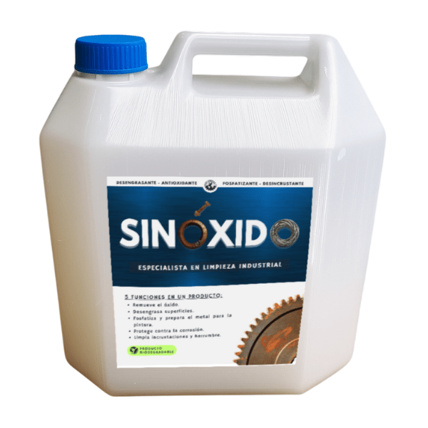 SINÓXIDO es un desoxidante industrial de alto rendimiento que elimina óxido, grasa e incrustaciones profundas, mientras fosfatiza y protege las superficies metálicas para restauración o pintura. Gracias a su fórmula avanzada, actúa como desengrasante, desincrustante, desoxidante, fosfatizante y antioxidante en un solo producto.